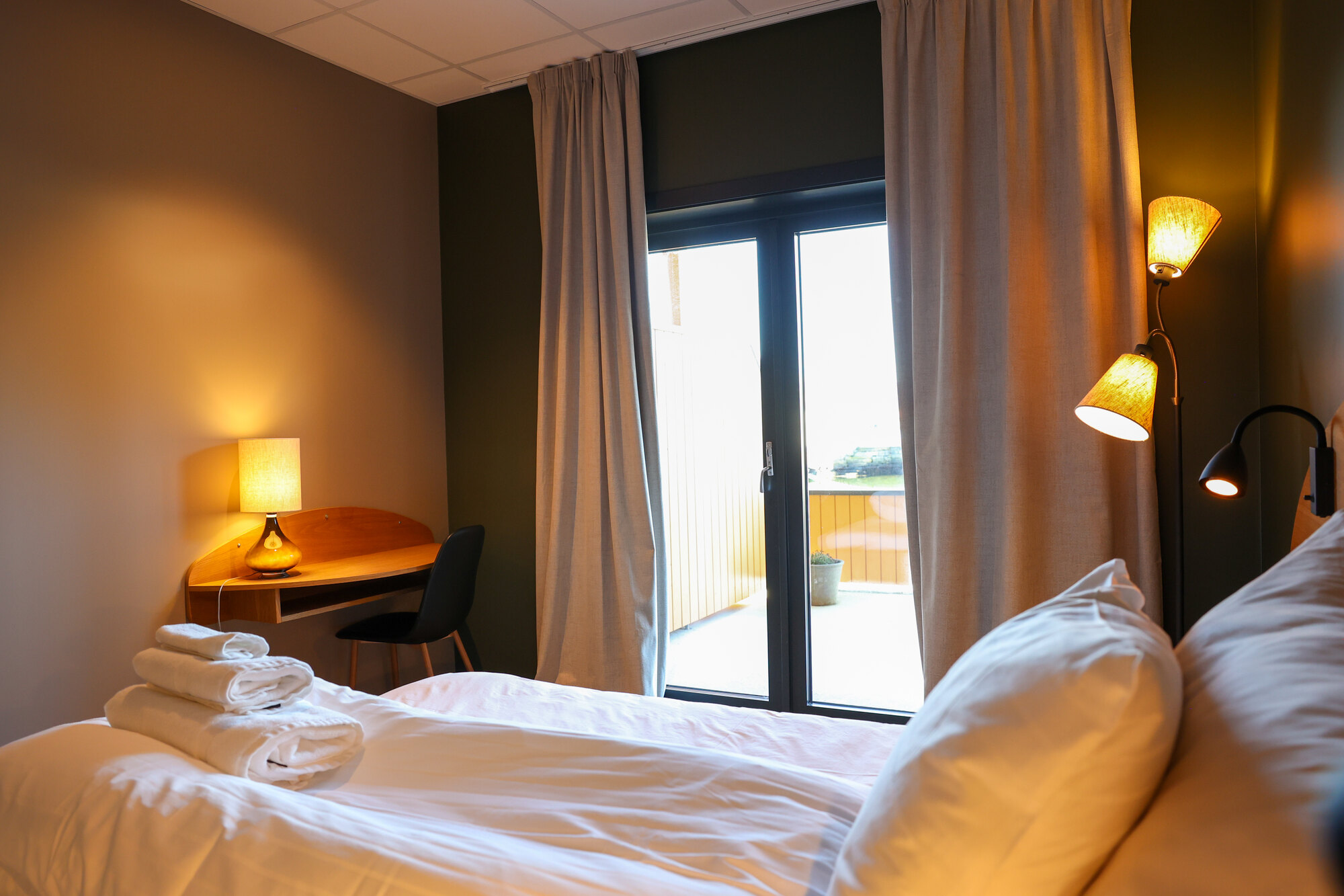 Fire komfortable dobbeltrom med bad og terrasse ved bryggekanten er klare for dem som ønsker en god natts søvn.